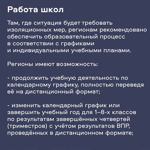 08.04.2020Минпросвещения подготовило и направило в регионы рекомендации, в которых представлены меры по обеспечению образовательного процесса при любых сценариях развития эпидемиологической ситуации.⠀Конкретные меры каждый регион определит самостоятельно, согласовав свои действия с Правительством страны.⠀Вот основные тезисы.⠀#Новости #Дистанционка #УчусьДома #стопкоронавирус #coronavirus