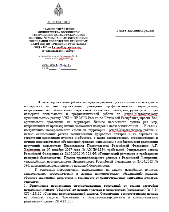 14.07.2020В целях организации работы по предотвращению роста количества пожаров и последствий от них, организации проведения профилактических мероприятий, направленных на стабилизацию оперативной обстановки с пожарами, руководство отдел надзорной деятельности и профилактической работы по Ачхой-Мартановскому муниципальному району УНД и ПР МЧС России по Чеченской Республике, просит Вас, организовать проведение на территории Вашего населенного пункта ряд мер, направленных на предотвращение возможных пожаров и последствий от них.