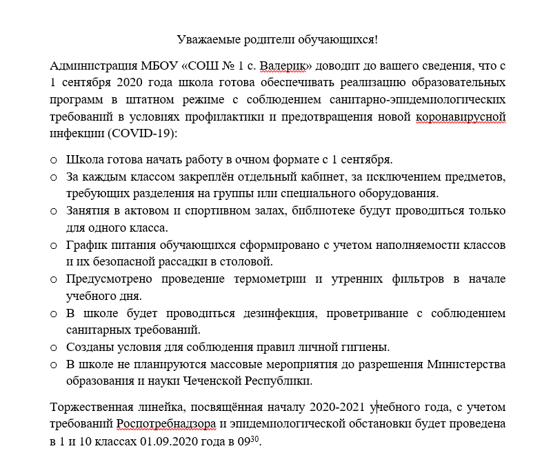 Администрация МБОУ «СОШ № 1 с. Валерик» доводит до вашего сведения, что с 1 сентября 2020 года школа готова обеспечивать реализацию образовательных программ в штатном режиме с соблюдением санитарно-эпидемиологических требований в условиях профилактики и предотвращения новой коронавирусной инфекции (COVID-19):