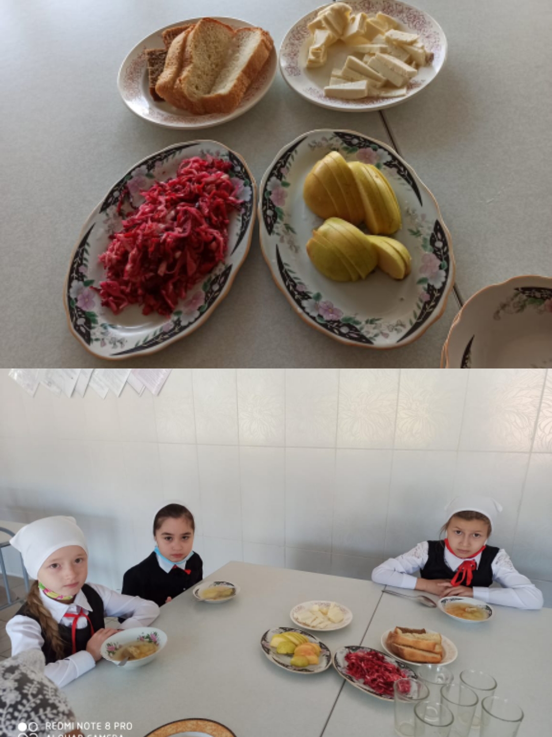 1) Суп с курицей; 2) Салат капустный; 3) Сыр порциями; 4) Хлеб; 5) Чай; 6) Яблоки.