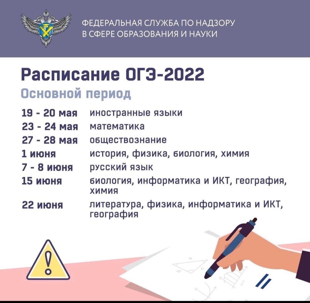 19 и 20 мая пройдут ОГЭ и ГВЭ-9 по иностранным языкам, 23 и 24 мая – по математике, 27 и 28 мая – по обществознанию, 1 июня – по истории, физике, биологии, химии, 7 и 8 июня – по русскому языку, 15 июня – по биологии, информатике и ИКТ, географии, химии, 22 июня – по литературе, физике, информатике и ИКТ, географии.