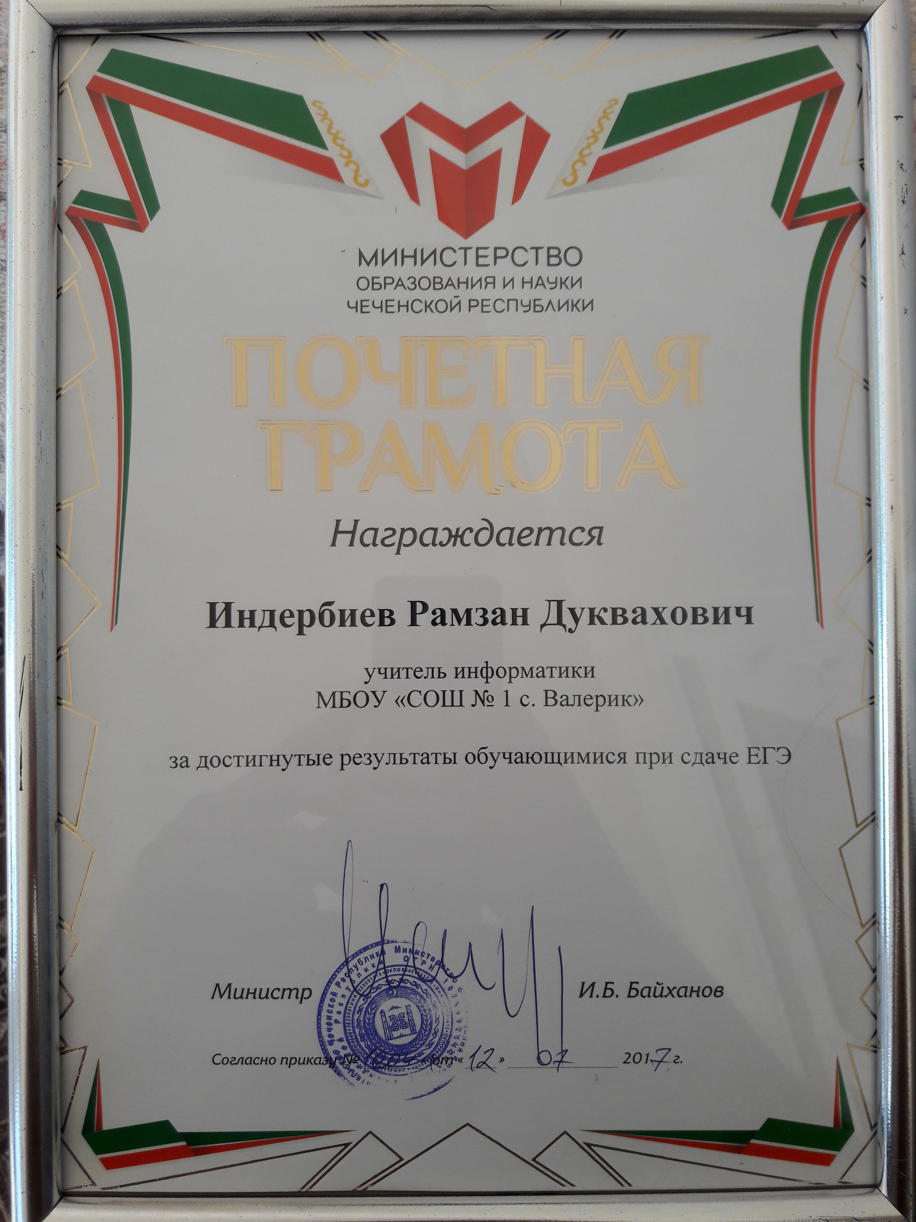 13.07.2017Министром образования и науки ЧР Байхановым И.Б. был награжден почетной грамотой за достигнутые результаты обучающимися при сдаче ЕГЭ учитель информатики Индербиев Р.Д. От всего коллектива школы и от себя лично желаю дальнейших успехов в деле обучения и воспитания обучающихся
